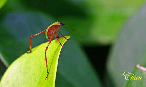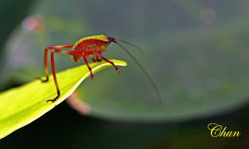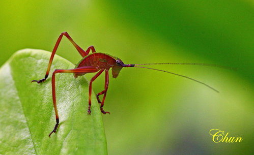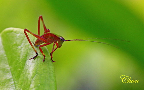 淡紅褐色的體色站在黃綠色的葉片上,極為醒目