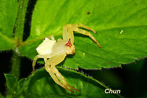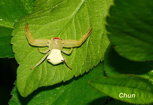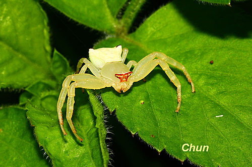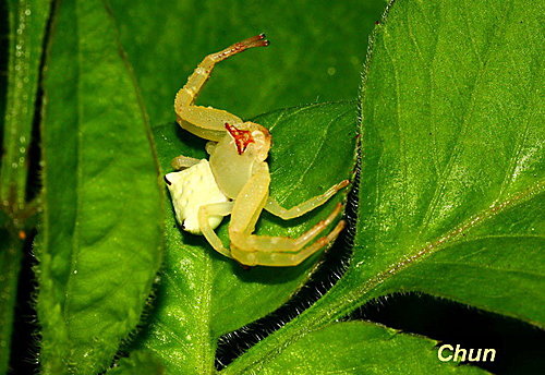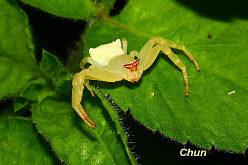 後經查資料,牠叫三角蟹蛛,難怪長得像螃蟹