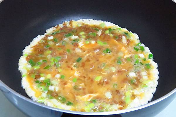 4.等到蛋汁凝固,翻面,稍煎,熄火起鍋 即完成