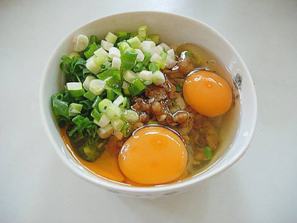 1. 蔥切成蔥花,把所有材料放入大碗中,拌勻