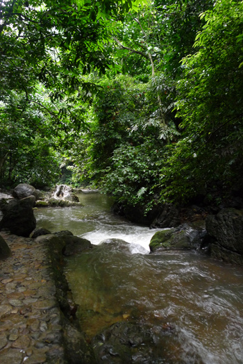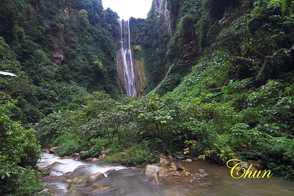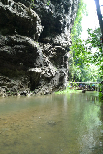深深的岩洞底水流潺潺,洞頂呈一線天