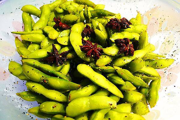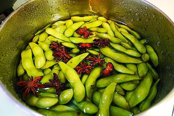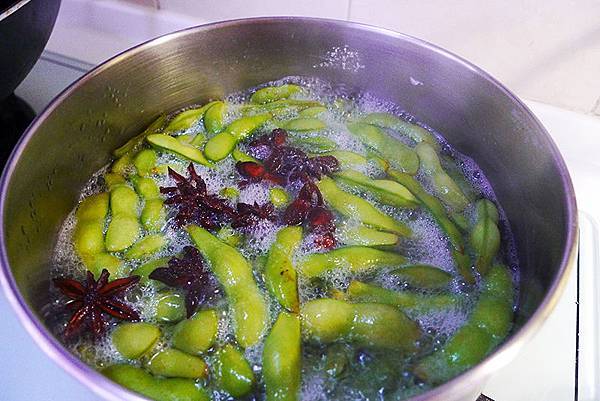 2.鍋中放入毛豆莢,加水,淹過毛豆莢即可