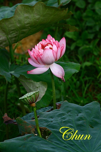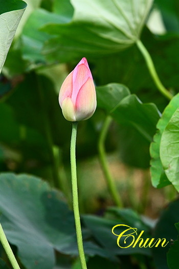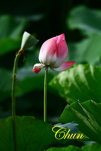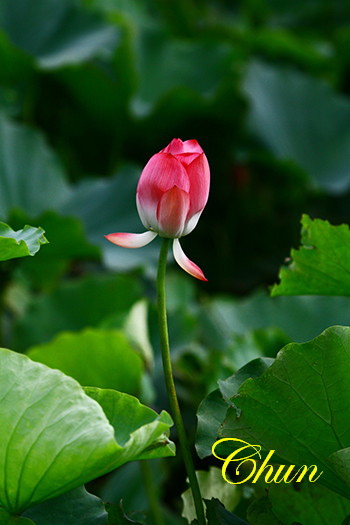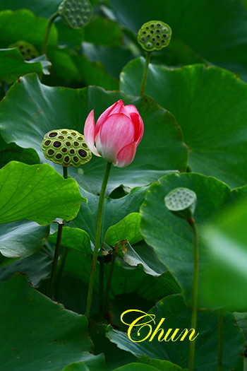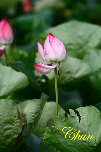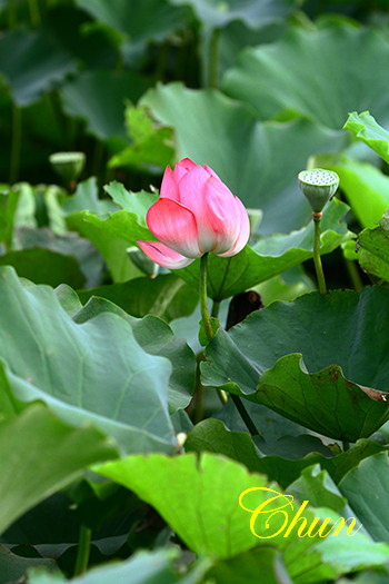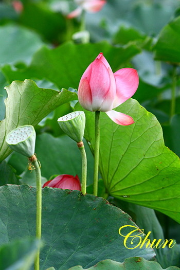 粉紅色荷花花苞點綴其間構成紅綠相間的畫面蠻療癒