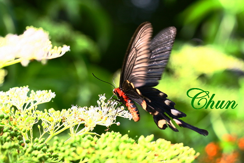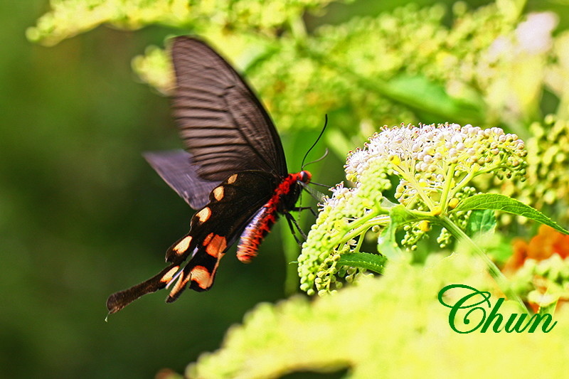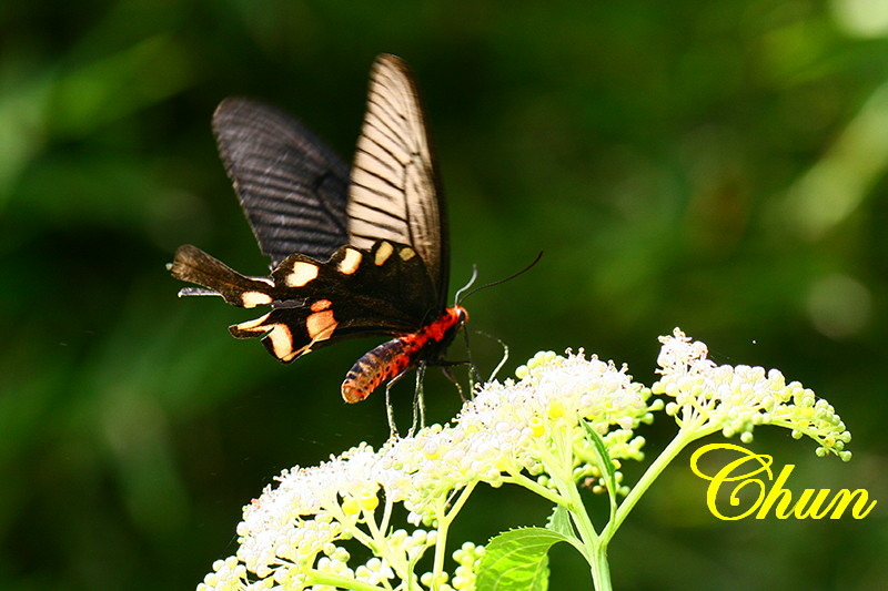 台灣麝香鳳蝶頭、胸部紅色下方具有黑斑