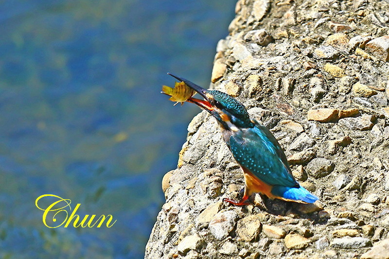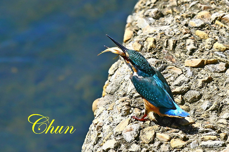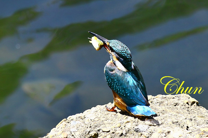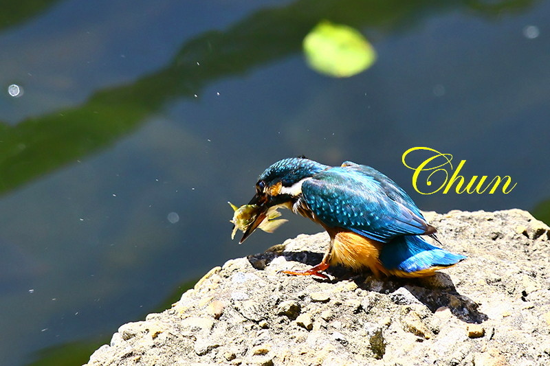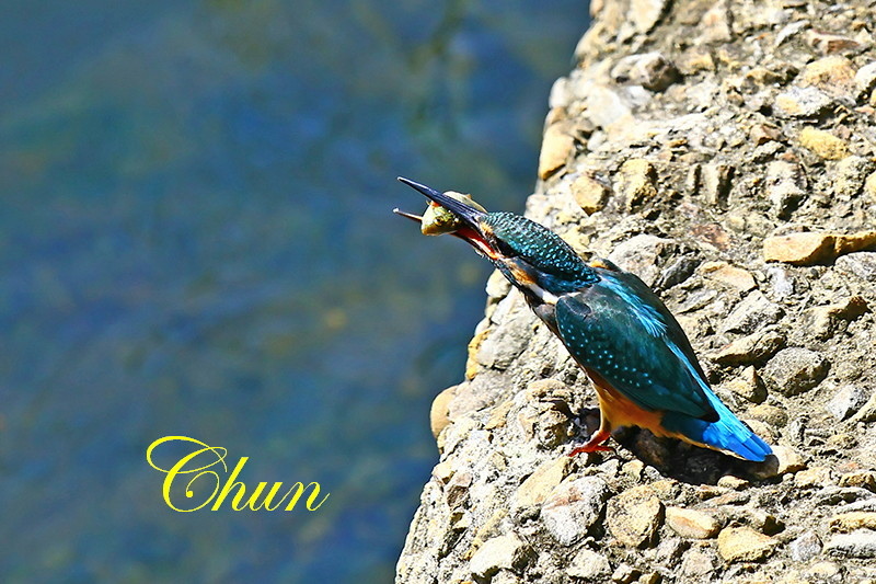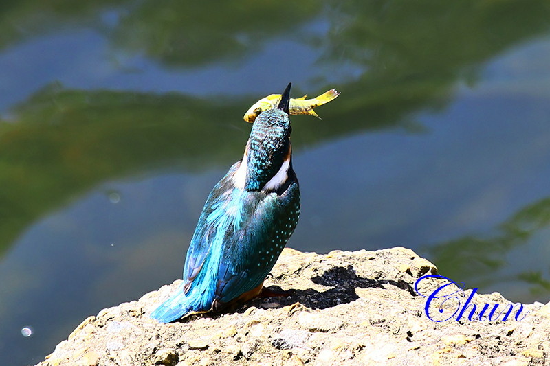 飛回岸邊,將魚拍打暈厥後將魚頭調整朝向口方向
