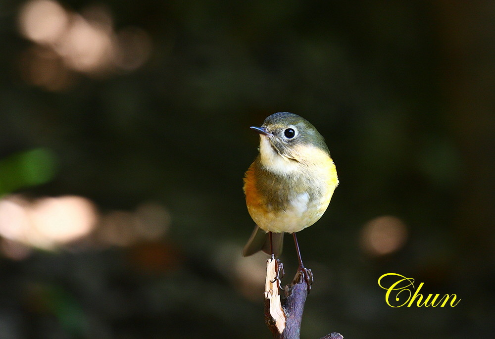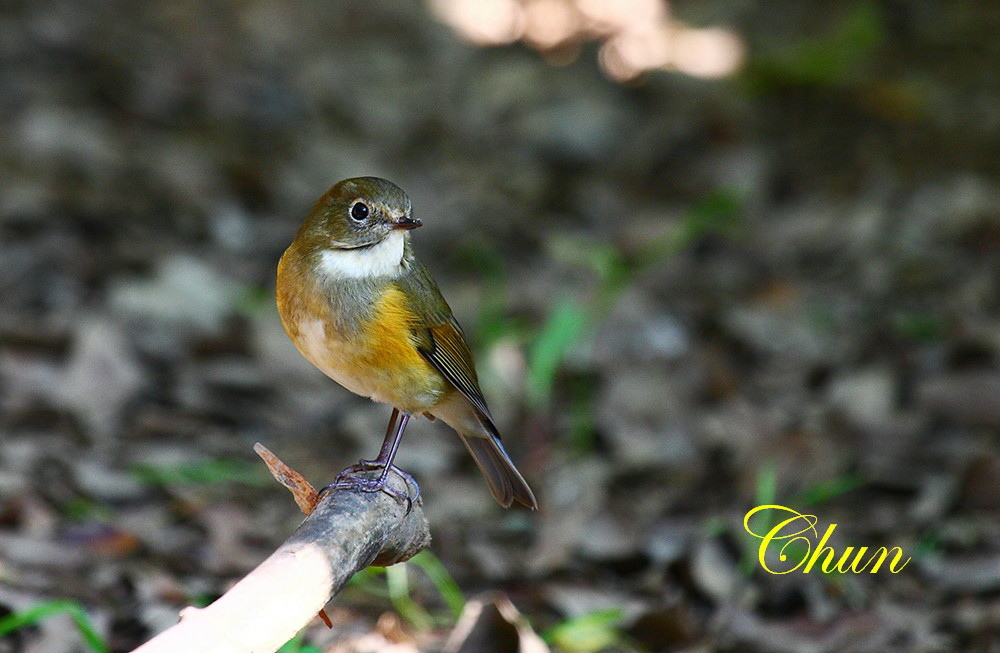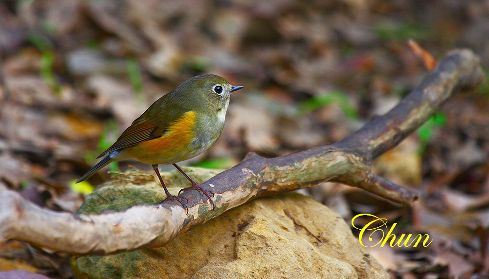 雄鳥:體污藍色,腹白色,側腹為橘黃色