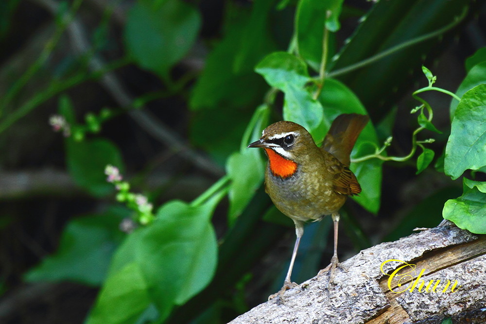 雄鳥喉部為鮮艷的紅色,雌鳥則為白色有淡紅斑