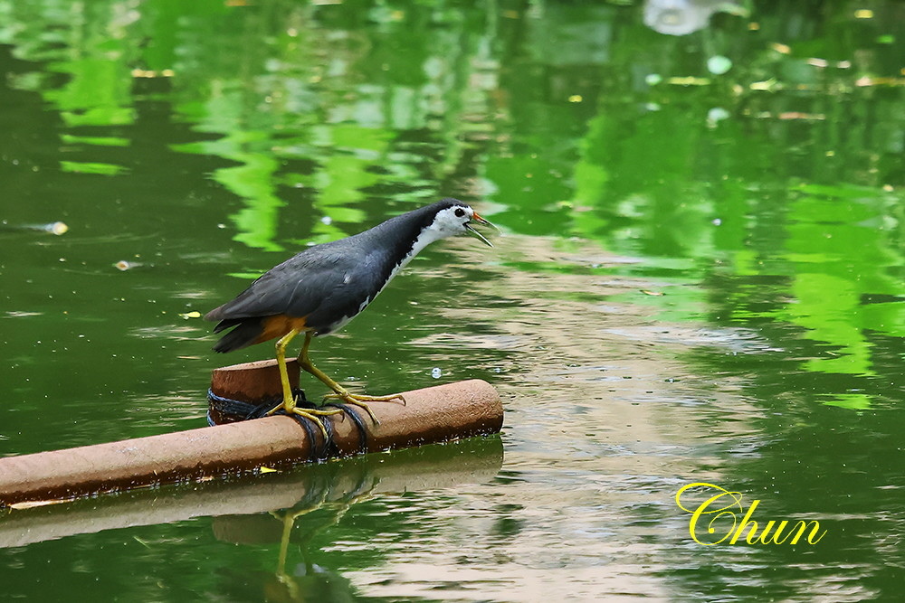 生態池欄杆上一隻白腹秧雞賣力的鳴叫