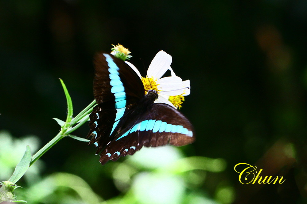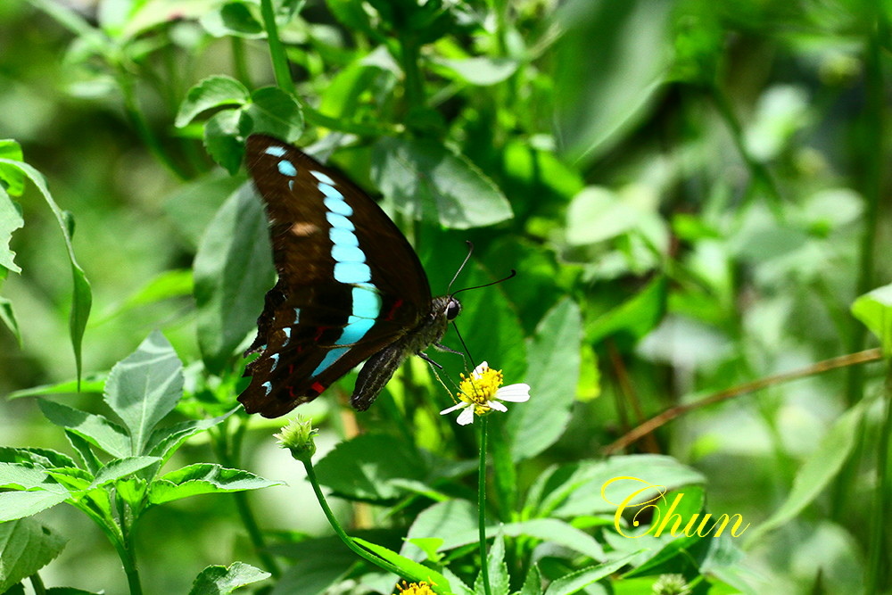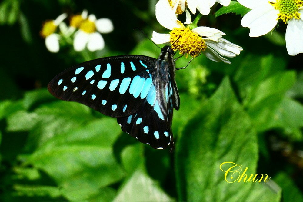 前翅中央有一條由許多水青色斑點組成的縱帶