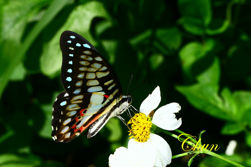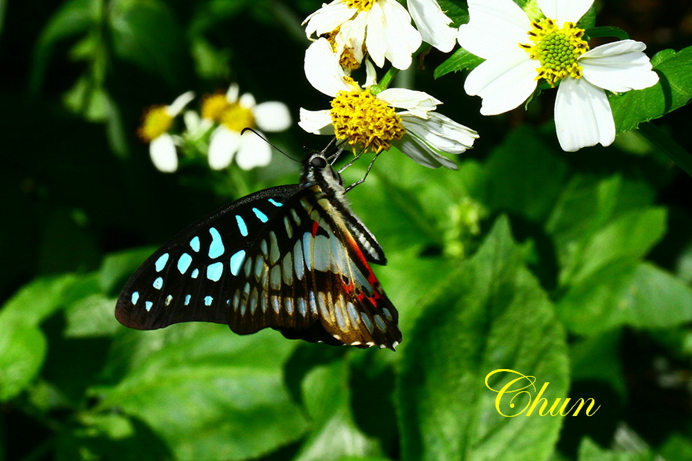 翅腹面青色斑較淡,後翅近後緣及基部有紅色斑紋分布