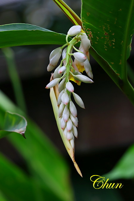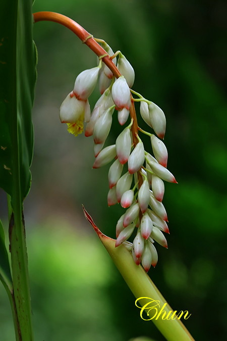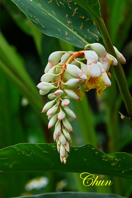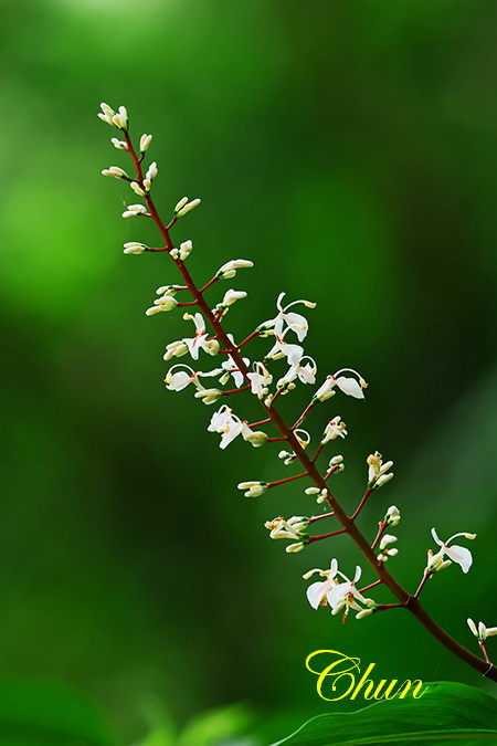 圓椎花序,直立頂生,花白色,帶紅色斑點和黃暈