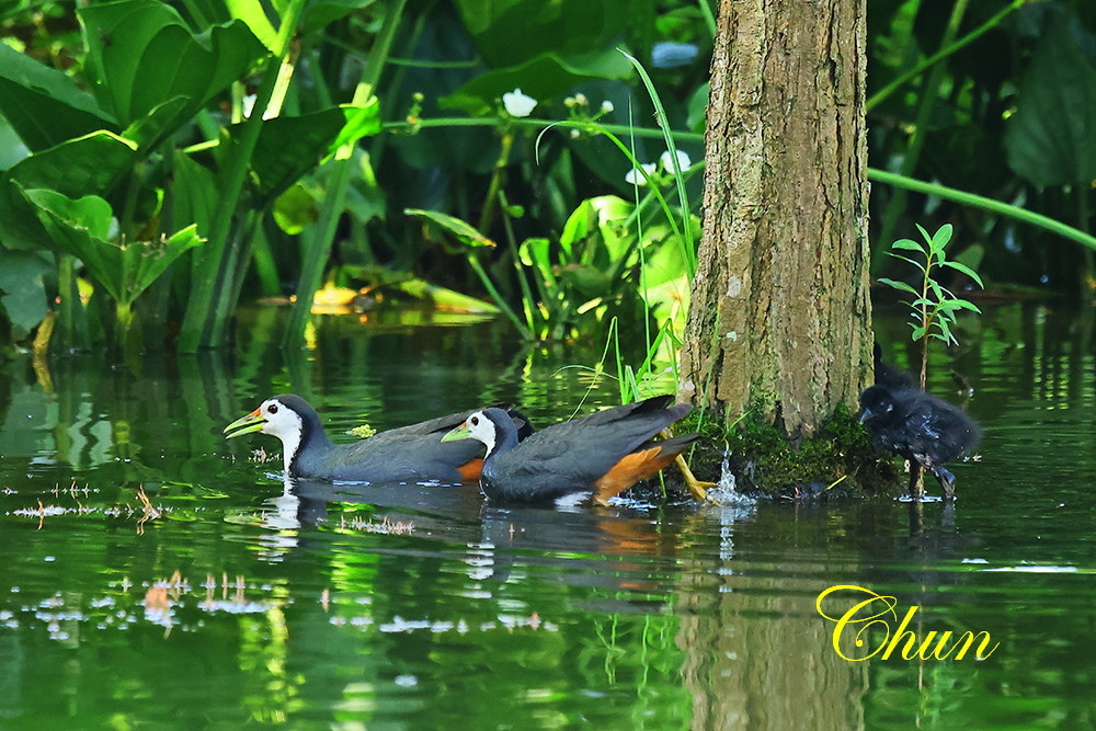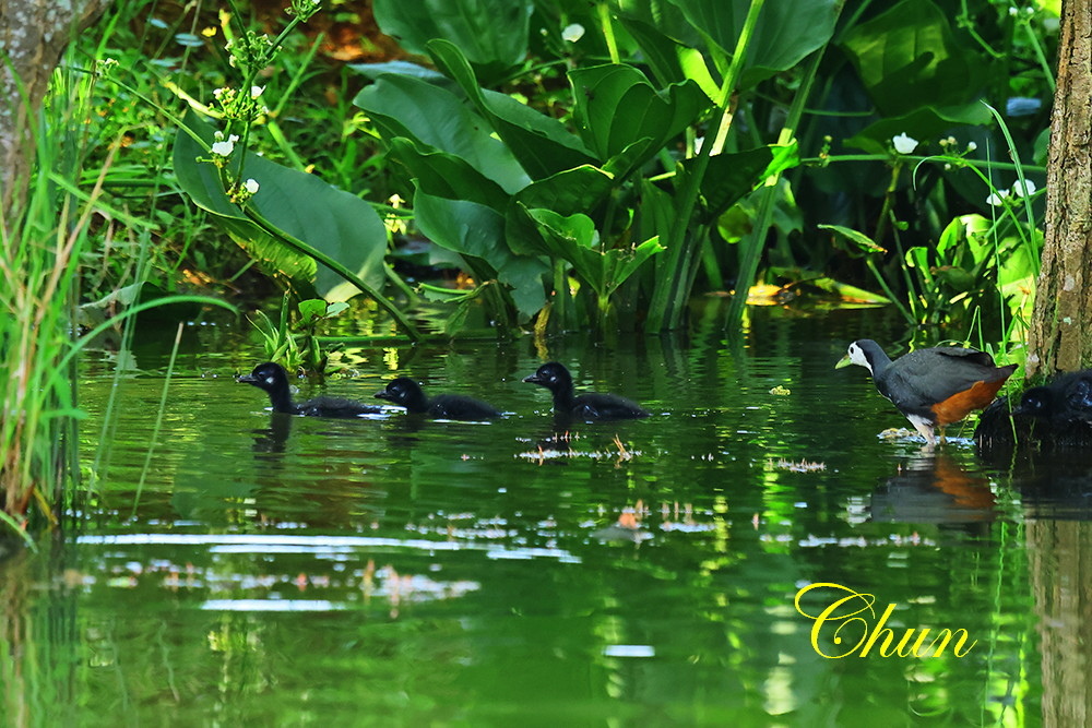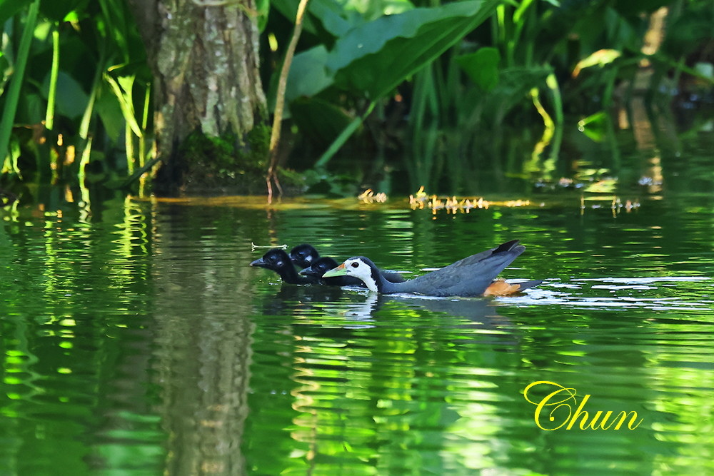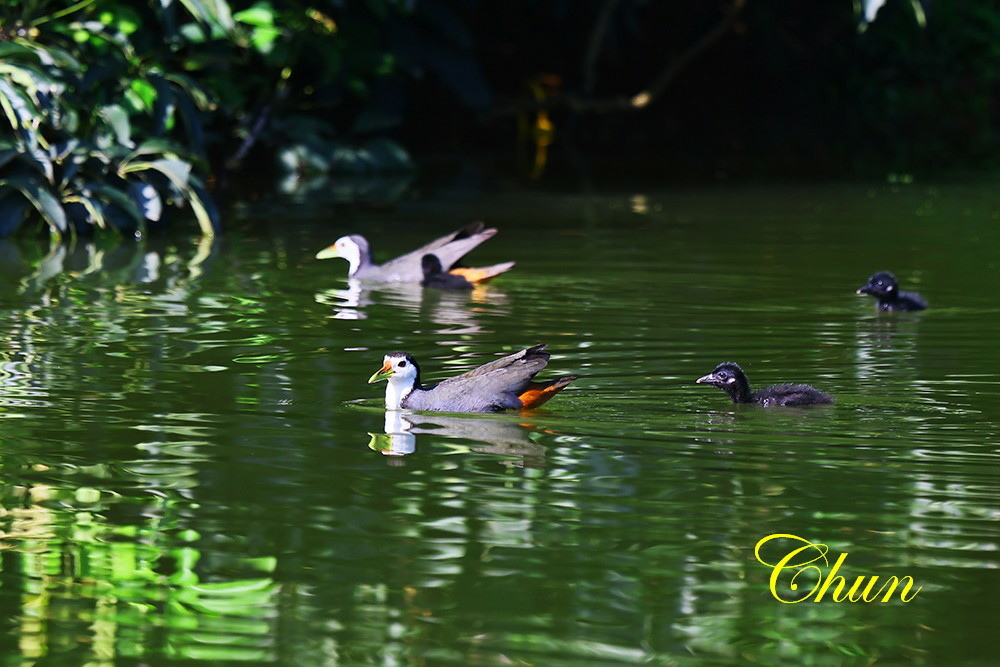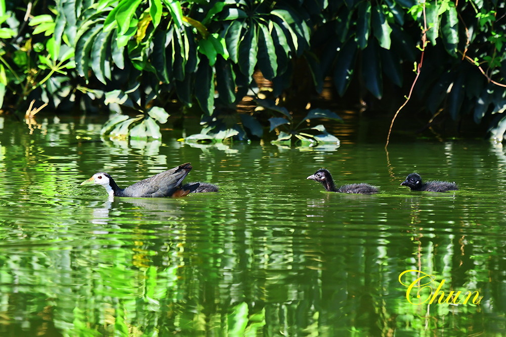 那天鳥緣極佳,才架好相機,親鳥帶著雛鳥出現在生態池上