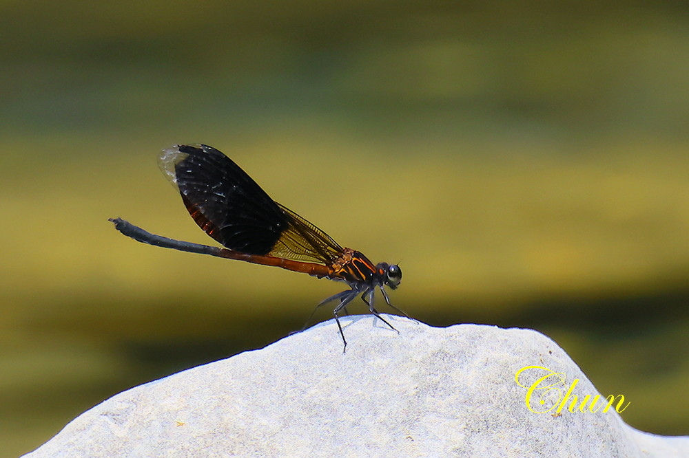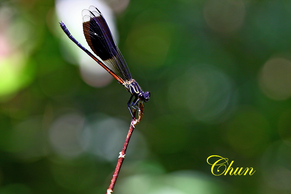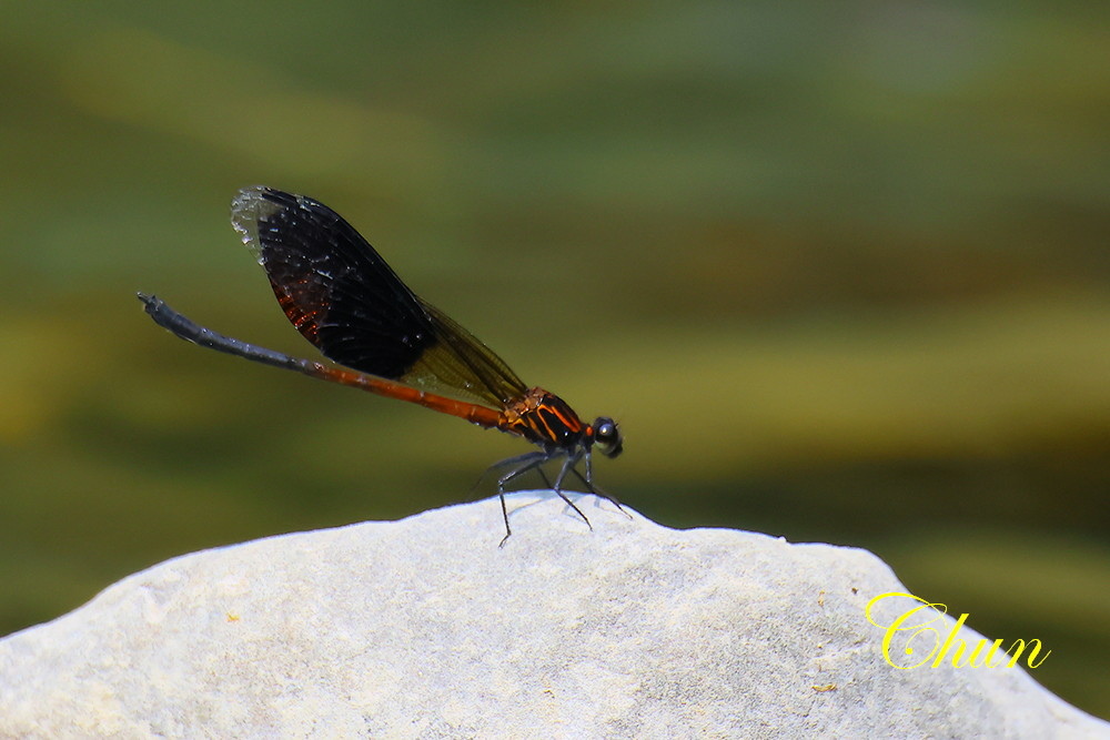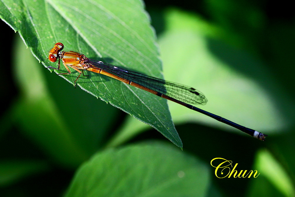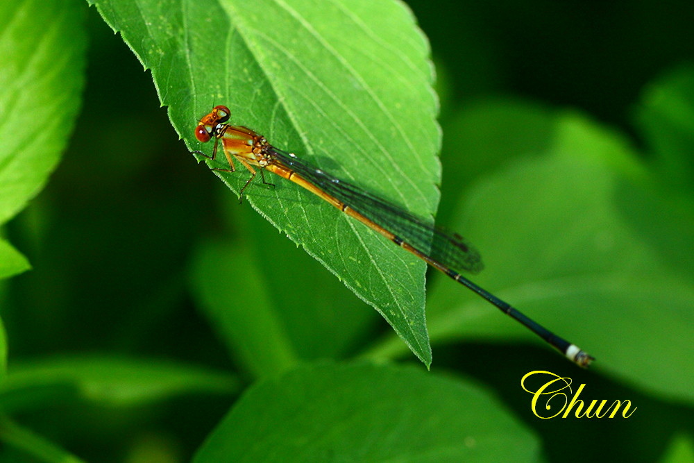↑短腹幽蟌(雄),成熟雄蟲胸部側邊的魚鉤狀紋為橙紅色